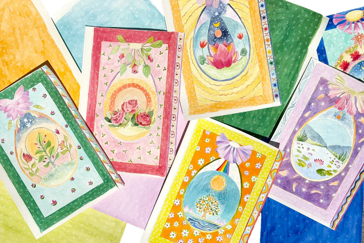 例えば、パオラが「リトルボックス オブ チャクラバランシング」のギフトボックスのためのアートワークに描いた蓮は、純粋さと精神的な目覚めを象徴しており、これはヒルデガルトの哲学の中心概念である、宇宙と調和して魂が栄えるという概念の核心です。
